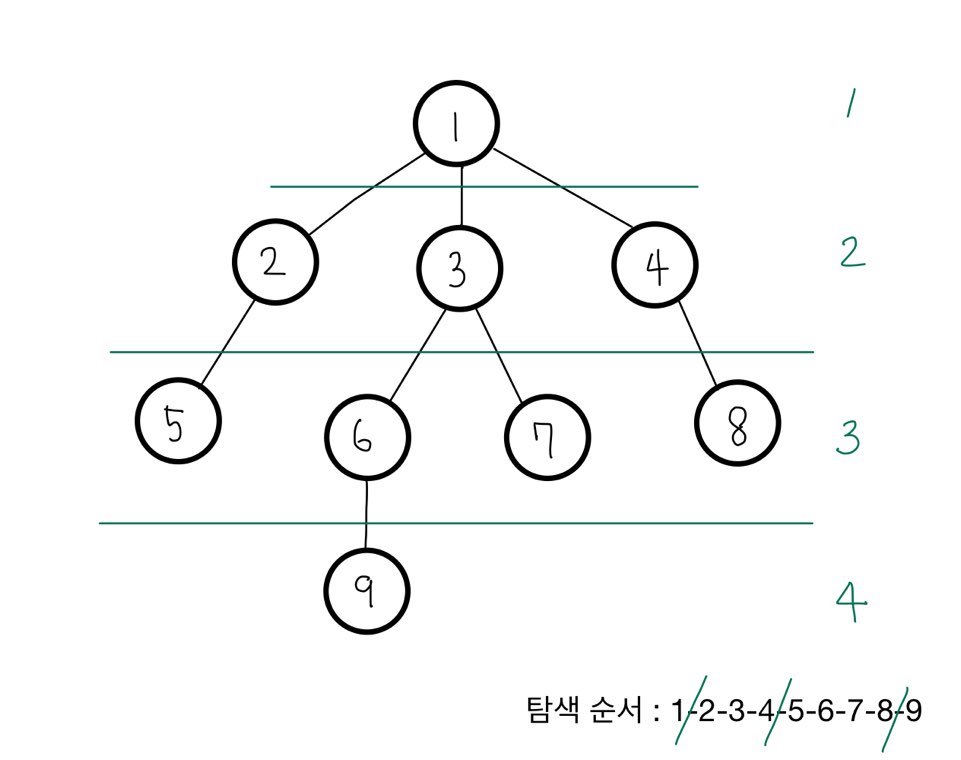 - 개념? 현재 정점에서 가까운 정점부터 순서대로 탐색하는 방법