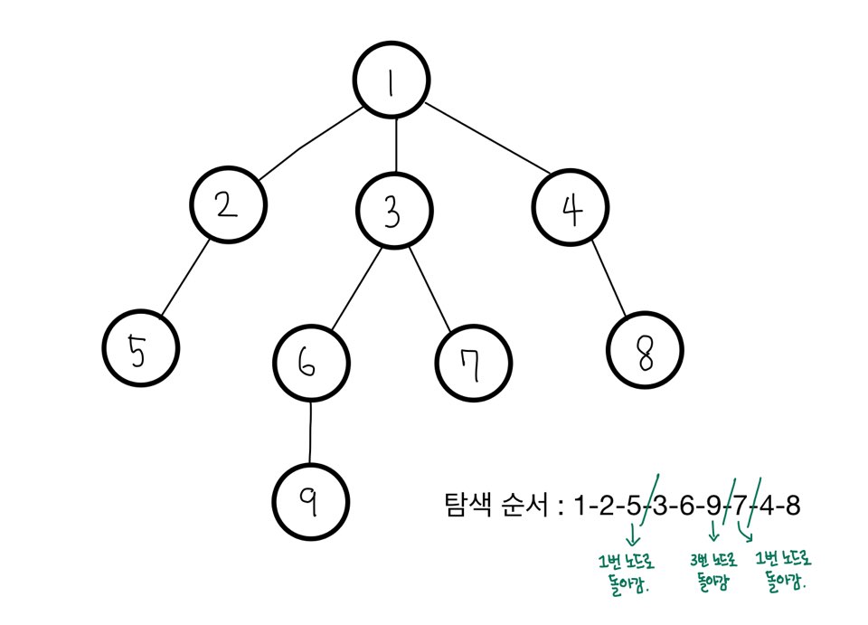 - 구현 방법? 스택 또는 재귀함수로 구현, 즉 후입선출(LIFO) 원칙으로 탐색