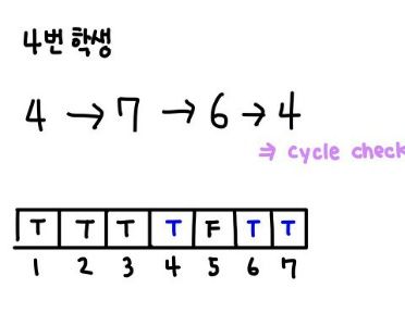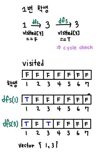 3.2 j가 확인했던 친구라면 vector에서 함수를 처음에 호출했던 학생 번호 i*로 사이클이 생기는 지 확인한다.
