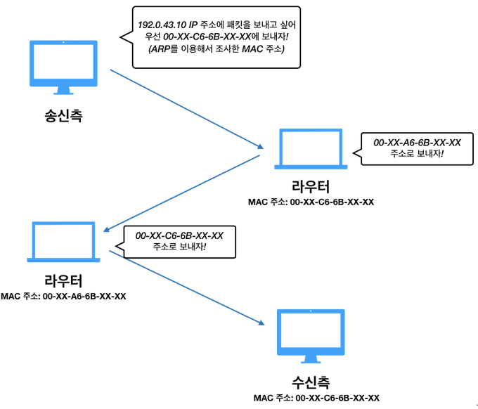 다음으로 중계할 곳의 MAC 주소를 사용하여 목적지를 찾아가는데